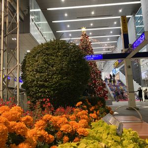 忘年会の帰り道、小倉駅にて。 マリーゴールドとクリスマスツリー