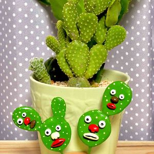 バニーカクタスと、その後ろは………何だっけ😅? 手前の小さな鉢に刺さってるピックは 私が作りました ウチワサボテンの妖精ピックです✨