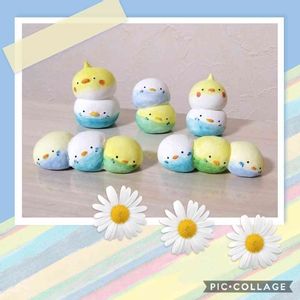 横並び『トリダンコ』ちゃん塗りました🎨✍💕 左後ろの子は前回のトリダンコちゃん 右奥は今回の子です🥰少し小さめ🐤 手前は横並びトリダンコちゃん❤️ 打ってる途中に寝ておりました😅💦