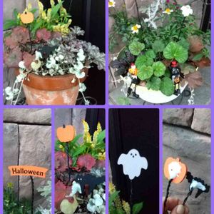 ~手作りピック~ 度々の投稿すみません💦(しかも同じ寄せ植え😓) 先程の投稿後、DAISOに行ったら可愛いハロウィンの飾りが!!👀✨ お人形2つと木製の小さな飾り(8こ入り)購入し、木製の飾りをピックにしました😄 家にあったワイヤー(1.6㎜)にグルーガンでベタベタ貼っただけです😊(ワイヤーとグルーガンもDAISOの) 同じ寄せ植えをさっき投稿したばかりですが、あの後急に作ったので投稿が重なってしまい申し訳ないです
