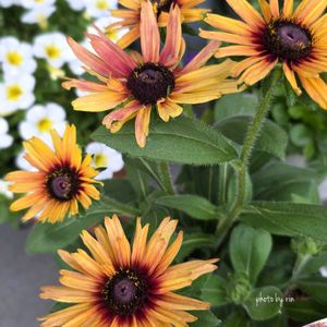 先日購入したルドベキアと唐辛子の寄せ植え🪴 最初ルドベキアと唐辛子で植えた④が寂しかったので家にあった苗を加えました☺️ ルドベキアの色が変わって赤ぽくなった、新しい花も赤いので日光の加減でかな?