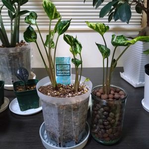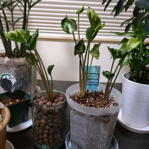 こんばんは✨ 三ツ星品質モニター🎵 シンゴニウム シュリンクハート。 本日植え付けました〜😃 3つに株分けして、2苗は4号の透明スリット鉢ネガミエルへ植え付け。 鉢底にはアクアセルを仕込みました😁(画像4枚目) 土は花ごころの「三ツ星室内観葉植物の土」を使用。 何故かって?? 同じ三ツ星だからさ〜🎵 ピートモスとバーミキュライトを少々混ぜ込みました🤭 そしてもう1苗はGS友さんの真似をして初のハイドロカルチャーにしました😃 株分け後に根っ子切っちゃったけど大丈夫かな。 そこが心配です😅