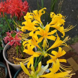 リコリス オーレア Lycoris aurea アルペンガーデンやまくささんより入手したオーレアが開花しました😍😍 中国東北部原産の野生選別種とのことです。 1ヶ月前に石黒紅葉園(@hanasaruku )さんから譲って頂いたオーレアを紹介しましたが、約1ヶ月程遅い開花ですね。 雌しべの先端が赤く染まるのと、下垂することから同じオーレアのラティフォリアだと思いますが、開花時期だけでなく、花色や花形も若干違うので産地による個体差かなと思います。日本のリコリスだけでなく、中国原産のリコリスも個性豊かでなかなか興味深いですね!
