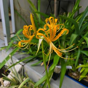 おはようございます☁️ 今朝のお花は 黄色いリコリス(ヒガンバナ)💛🧡 お隣さんから数年前にいただいたので ヒガンバナなのかリコリスなのか…🤔 今年は1本だけ咲きました✨ 長いシべ大好きです🎶