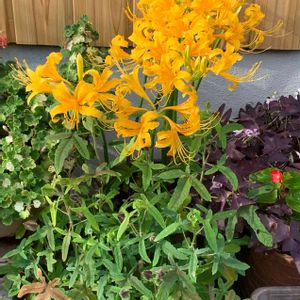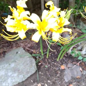 黄色いヒガンバナの仲間、リコリス・オーレアが咲きました✨。 黄色いヒガンバナはいくつか系統があるみたいですが区別がよく分かりません😆。 何年か前にホームセンターで買った球根です。