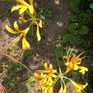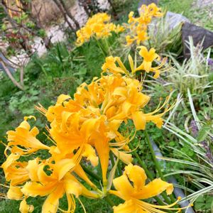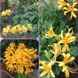《リコリス・オーレア》 9/26に投稿したリコリス・オーレアが、庭のあちらこちらで華やかに咲いています💛✨。球根なので、増やしやすいです😊💖 濃い黄色の花が大変美しく、また、ヒガンバナ属の中では最も花が大きいので、よく目立ちます。葉もとても大きく、丈夫で、毎年よく咲いてくれます。 *ショウキズイセンやショウキランとも呼ばれているようですね✨。