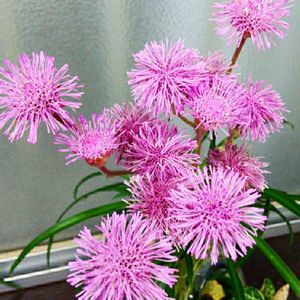 今日のお花、アザミ・・・とはつくものの、正確にはアザミではないのですが、現在わが家のアザミは咲いてないので、今まさに咲いているこちらをUPしますねー🤗これは、名前にはアザミと付きますがアザミ属ではなくショウジョウハグマ属の植物で、南アフリカ原産で英名はPompom Weed(ポンポン草)といいます。 日本で園芸的に流通したのは2000年以降だそうで、「桃色花火」の名で売られていたのを購入したことがあります、こぼれ種で庭のあちこちから出て数年持っていたのですが、消えてしまい、去年ネットで矮性種という「プレーリーマスコット」という品種を見つけて購入してみました。 小さい鉢で宿根してくれて、今年も咲きました。 桃色花火のほうは1m以上にはなったので、確かにこちらは矮性のようですが、60cmくらいにはなりますね😊 刺はなく、ほわほわしたお花は、英名の通り毛糸のポンポンみたいに可愛いです。 葉に香りがあるから付いた和名だそうですが、葉を軽くもんでみても、さほど香らしい香りは感じませんね😅💦 こぼれ種で野原などに生えてくることもあるようで、地方によっては特定外来種扱いになっているようですね。わが家では数年で絶えてしまったし、自生した小物を見かけることもないのですが、条件が合えば宿根して生え広がったりする可能性はあるのでしょうね。種を飛ばさないよう花後は気をつけて摘み取るようにします。