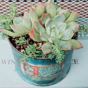 おはようございます🌞 あっ❗️買うときに名前を確認するのを忘れてしまった...😞💨 アンティークお魚缶風リメ缶に、1つの大きな根っこに、4つの子どもをつけた多肉さんの寄せ植えを作りました😃🍀 店主の方が、茎のところで切って挿した方が、元気に育つと仰っていたので、ふっくら寄せみたいになるかなと、セダムも一緒に植えてみました😊しっかり根付くといいなあ🥰💖