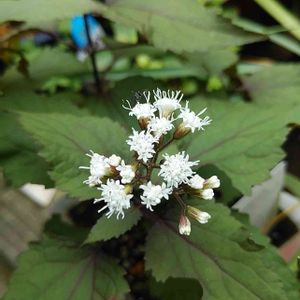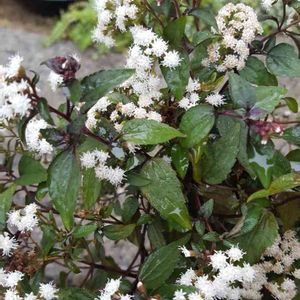 お庭で満開です🌼*・ 『ユーパトリューム チョコレート』 Ageratina altissima 'Chocolate' Eupatorium rugosum 'Chocolate' (銅葉フジバカマ、シソバフジバカマ) 花が咲かない時期、母がシソと間違えたくらいシソ色しています✨カラーリーフだけでも可愛いのに、お花も可愛い😍 何だかブンブンミツバチ🐝...が見た事ないくらい飛んでいてびっくりでした😳蜜が美味しいのかしら⁉️🤭