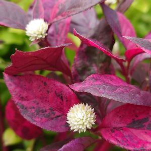 ~アカバセンニチコウ レッドフラッシュ~です💗 こぼれ種で 花はまだですが、 草丈も伸びてきました🎵 対生に披針形の赤、暗紫色の葉をつけ、 秋になると鮮やかな美しい赤色になります。 花期は10~11月、球形の花序を出し、 白色の花を密生して付けます。