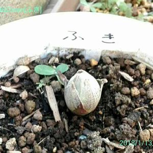 フキ 去年ダイソーで買ったコ。 夏に芽吹いて、今はこんな感じ。 フキノトウ見れるの楽しみだなぁ♪