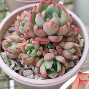 とてもゆっくりですが 少しずつ成長している様です カットした小さい頭を置いてからここまで2年半💦 成長スイッチが入り葉の色がみどり💚になり、エッジのピンクがよりくっきり見えて可愛さ倍増です♪