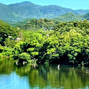 井手ヶ原河川公園の椹野川 井手ヶ原橋から ダイサギ7羽アオサギ、カワウがいました 今朝の早朝散歩で