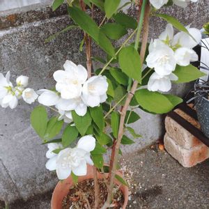 バイカウツギ 義理の両親の方のお庭からやって来ました! 突然「白い花増えたからね~!」と声をかけられ「ん?(・・。)ん?」と外を見てみると、他の鉢に混ぜって置いてあった(笑) 私に上手に育てられるかしら……😅