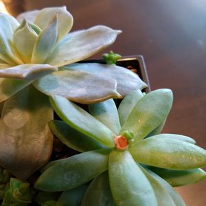 1枚目 アークティックアイス。 徒長したのを胴切りした子。しっかり根っこ出てきてる🥰 他の葉っぱたちもぼちぼち😆 2枚目 外に放置の葉挿し。 室内管理よりもこっちのが育ちが良い… 真夏の真南向きのベランダなのに…なぜ…