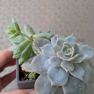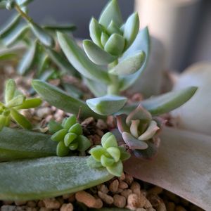 鉢減らしの寄せ植え ゴースティ(桜牡丹)の子株をかっとして入れた🌱 ブルーエルフは頭にできてた子株をカットして親の隣へ ブルーブリトー増えすぎて困ってきた… セデベリアって強いのね✨ 何にも気にしないで見た目で買ったらブルーエルフもセデベリアなのね🤣