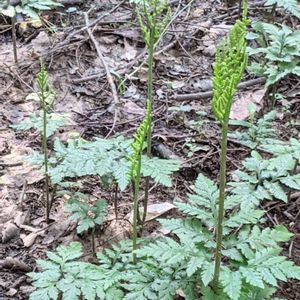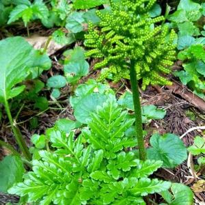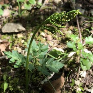 フユノハナワラビ カンワラビ 明るく刈り取られた林道で 毎月4日はシダの日🏷️ 下に見えるのは栄養葉といって、光合成を担っているのだが、そこから伸びている子持ちワカメのような胞子葉はこれから金色になり、少し離れたところからだと花のようにも見える(^-^)