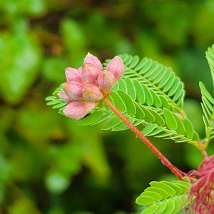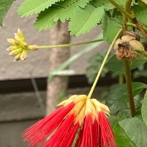"キュートな金曜日" 庭のヒネム(緋合歓)ちゃん。 蕾(①)、咲き始め(②)、開花後(③④)、葉っぱ(④)、みんな可愛いな。 📷️ 2025.8.21