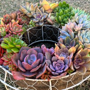 多肉寄せ植え会 初めての多肉寄せ植えの方 大きなリース 高さを揃えエケベリアの顔を見ながらの作成 ホームセンターで忘れ去られて3頭に育ってた子をメインに♪ 普及種 淡いお色で多肉揃えて💓 リースの口が広くて沢山入りました ピンクカラーで可愛くできたかな💓 とっても喜んでいただけて嬉しいです!