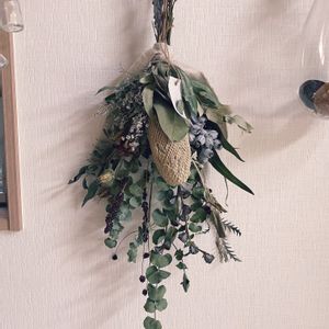 本日のスワッグです♫ とってもボリュームがありソーラーフラワーやバンクシア グレビリアゴールドにイタリアンルスカスホワイトなど人気のリーフや花材がたっぷりでかわいい♡ ブーケや花束としてもお使いになれます。 お部屋のアクセントにも素敵だと思います。 こちらご購入できます 目にとまり気になりましたら気軽にご連絡ください♫
