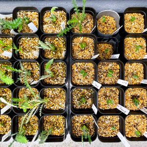 春に蒔いたバンクシアです。 左半分が4月蒔き、右半分が5月蒔き。 1ヶ月の生長の差が分かりやすいです。