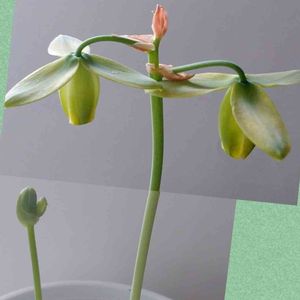 今年の新春売り出しで、オザキフラワパークで買ったアルブカ。 激安だったのに会員価格が、いつもより安く、花は来年かなと思っていたのに、花が咲く。😊 追伸、バックの写り込みは、御勘弁ください。