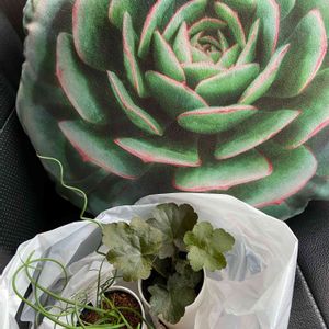 今日の収穫💚ダイソー岐南店でアルブカと、ヒューケラかな?🤫だったら嬉しいなあ😌エケベリアのクッションは、ニトリで以前一目惚れしてドライブのお供になってます💚