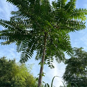 盧花恒春園にて上を見上げたら 背の高い木の新芽が美しい シンジュ(神樹)ニワウルシ
