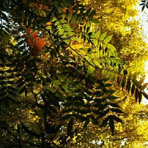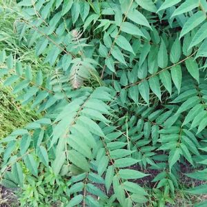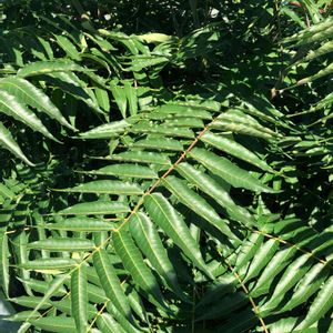 庭漆(ニワウルシ)/神樹(シンジュ) ニガキ科ニワウルシ属の落葉高木。中国原産で明治時代初期に成長の早い有用樹として導入され街路樹や公園などに植えらた。また、シンジュサンという蛾の幼虫が好む食草なので、養蚕のために各地に植えられた。今では河原や土手、空き地などに野生化している。繁殖力が強く、根からも萌芽する。葉は大形の奇数羽状複葉でウルシに似るがウルシ科ではなくかぶれる成分はない。小葉の基部には鋸歯が1~2対あり、鋸歯の先に蜜腺があるのが特徴。葉に触るとごまのような独特の香りがする。花期は5~6月。雌雄異株で花は雌雄とも径7㎜と小さく緑白色で地味だが、甘い蜜と独特のにおいを出してハチを集める。雌株にできる果実は緑色から段々と赤みを帯び、秋に褐色に熟す。冬も枝に残り花のように見える。果実は翼果で2~5個の分果に分かれる。薄い翼を大きく広げたほぼ中央に種子があるが、きまって重心は少しずれ、翼の端がキャンディーの包みのように軽くねじれる。その結果、縦方向に回転しながら大きくらせんを描いて飛ぶという複雑な飛行をする。果実の形や落ちる角度によってはひらひら舞うこともある。 名前は、ウルシに似ていて、観賞用に庭に植えられたことに由来する。成長が早く高木になることから、英語では『tree of heaven(天の木、神の木)』、ドイツ語では『Gtterbaum(神樹)』という。別名の神樹(シンジュ)は英名の直訳。 出典『里山の花木 ハンドブック』『身近な草木の実とタネ ハンドブック』『樹木の名前』