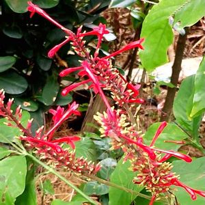 農道沿いの畑の側に植えられていました。 『ベニツツバナ』筒状の赤い花💐で 初めてみました🌺🥀🌹☘️🌿 キツネノマゴ科 ベニツツバナ属 中央アメリカやメキシコ原産で、暖地の庭園や公園などで植栽され、沖縄県では野生化し帰化植物となっている常緑小低木。 (ネットより)