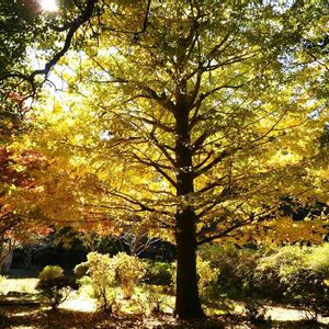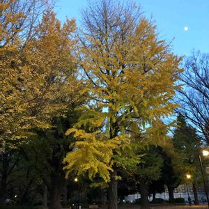 イチョウ(銀杏)の黄葉が見られます。 木によっては、まだまだ緑のイチョウもありますね😉 木の陰から覗くと、葉が光って✨きれいに見えました🍂
