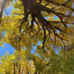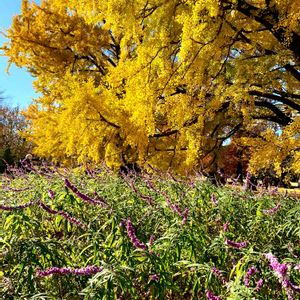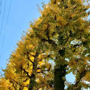 【No319 イチョウ】 家の近く、妻の母校の小学校のオオイチョウが綺麗に黄葉しています。 イチョウは熊本市の木でもあります。熊本城🏯が昔から銀杏城と呼ばれてきましたからです。沖縄を除くと、日本の街路樹の約1割がイチョウだそうです。 イチョウの黄葉は、時期こそ違えど「今年の色づきは違う」とか「この地のイチョウは違う」ということはないそうです。緑色の色素「クロロフィル」が気温が下がると消えていき、黄色の色素「カロテノイド」が目立ってくるようです。 この木は大正時代に植えられた、と書かれていました。