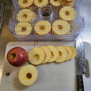 🍎「ドライ アップル」 仕込12月16日pm9:56 ✧p📷qω•,,´)パシャ✧ 完成12月17日am10:00 ✧p📷qω•,,´)パシャ✧ フードドライヤーを使って、ドライフルーツを作ってみた。 今回で2回目なんです。 ドライヤーを掛けている時間が、今回は75℃で12時間掛けてます。 5~7mm程で切った🍎が、水分が飛んで半分くらいの厚みになります。 凝縮されて、味が濃くなって美味しいのです。😋 今年の春から夏頃にかけて、このフードドライヤーでジャーキーをよく作りました。 (🍺•᎑•🍺)のつまみに何度も作った。ꉂ🤣𐤔 乾燥して出来上がったものを、その後にサクラチップで燻製にて美味しく頂きました。 暖かな時期に自然乾燥で作ると、雑菌が湧いて怖いですが、このフードドライヤーがあれば時間短縮ができるので安心ですね。 ドライフルーツの話から、ジャーキーになっちゃった💦 次は干し芋を作ってみようかな🍠 レシピ見てこよっと👀📚✍🏻🎶
