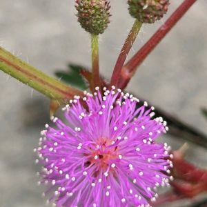 「オジギソウ」 9月4日am8:50頃 ✧p📷qω•,,´)パシャ✧ オジギソウの花が1つ咲きました。 めちゃ可愛いでしょう♥️ 毎年こぼれ種から🌱芽を出してくれてます。 だから、この数年 買って来ないです。 今年は4苗を植え込んでみたら、翌週には またふた苗、そしてまたふた苗発見ꉂ🤣𐤔 全部で10苗あります。 また来週になると、どこからか芽生えてくるかもしれないです。 可愛い花が咲くから、良いですよね👌😃✌️🎶