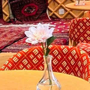 眺望が素敵でかわいらしい トルクメニスタン館レストラン❣️ 咲洲コスモタワーもちいさく見えています… ウォータープラザの黒松を上から撮ってみたいとおもっていました💚💚 テーブルのお花は ハスに似ていますか⁉️ パロウという炊き込みごはんが まだ炊きあがっていませんでした〜😭