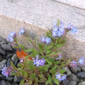 おはよーございます☁ 玄関横のいぬばしりのそばで、 わすれな草が咲いています💕 雑草扱いですが😅毎年どこかで咲いています😊 拡大して花をよ一く見ると🔎 可愛い❤ですねぇ