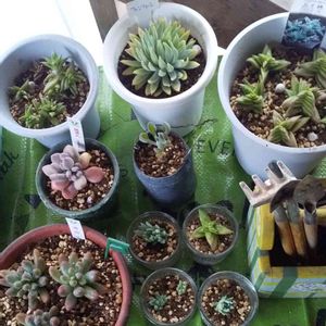 大型台風が接近中ですね😣 皆様台風への備え、お疲れ様です‼️ さて、今日はクリスタルさんちからお迎えさせていただいた、たくさんのピンキーの脇芽を植えました🌱可愛い子達です💕 おまけでいただいた高千穂の葉挿しもチャレンジスタートです☺ 更にもうひとつのおまけ、ミルクゥージも寄せ植えにin🍀 クリスタルさん❣️ありがとうございました😊植え方、大丈夫そうでしょうか?💦 どの子も元気に育ちますように😌 ではでは台風には引き続き用心して過ごしましょうねー😰台風のために室内に避難させた植物たちを見て、少しでも心を落ち着かせて過ごします🍀