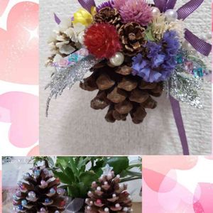 できたてです😃 ハロウィン🎃飛び越し、松ぼっくりでオーナメント🎗🎄作ってみました。 松ぼっくりは10cmくらい大きめ。小花は我が家の花と…🍀頂いた千日紅をドライ🏵にした花達を使いました🤗💕 下の🎄は昨年の作です。