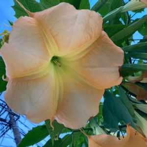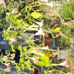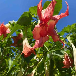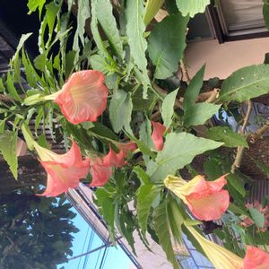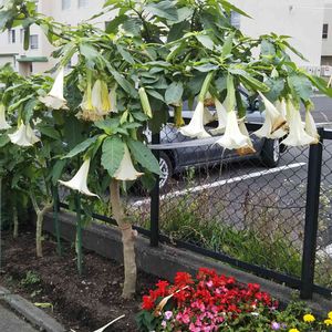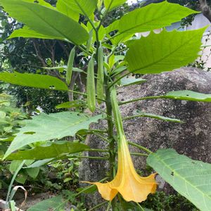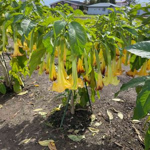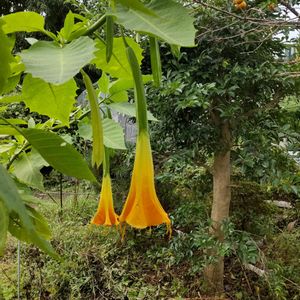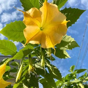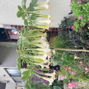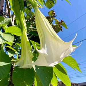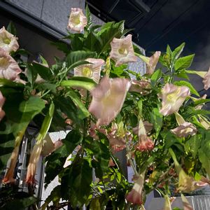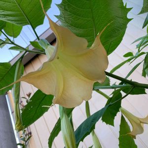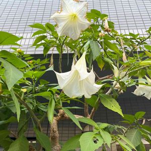 キダチチョウセンアサガオです。 園芸名ではエンゼルストランペットと呼ばれる事が多いです。 別名 天使のラッパ 朝鮮朝顔 ブルグマンシア(正式名) 手前のコンクリート塀の下に昨日投稿したオジギソウの花がいっぱい咲いていました。