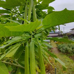 エンジェルトランペットが咲いていた所だと思うのですが……。 大きな豆がぶら下がっていました。