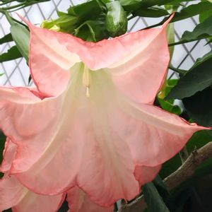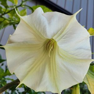 エンゼルストランペット 白のエンゼルストランペットが咲いてきました 下からのぞいたら 当たり前だけど真ん丸でした