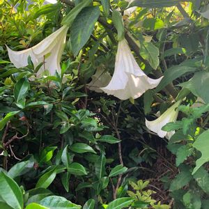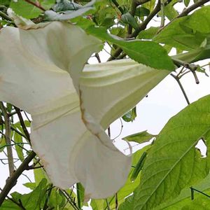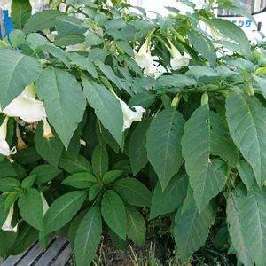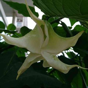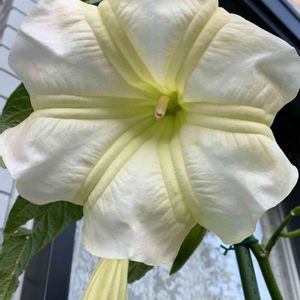 庭のかなり大きい白い花‼️実物のラッパくらいある大きさ‼️これも名前がわかりません‼️花も大きいですが、葉っぱも大きい。