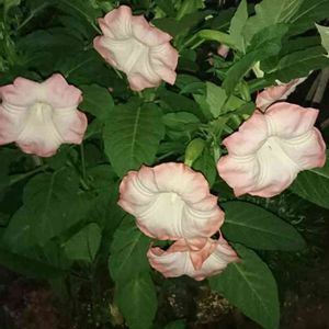 こちら、夜に撮影しました 花も葉も、ぐうぅっと上向いてるのがおわかりですか? そして、辺り一面にすばらしい芳香が漂います。 夏の夜の庭、うっとりするようなひとときを何度も味わいました~💖 ピンクのトランペット、おすすめです✨