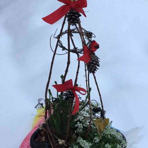 お疲れ様です ツリーがないので、剪定した枝を利用して 飾れました。 趣味の園芸で手作りツリー の放送見て 雪の中まで鉢を運びました。