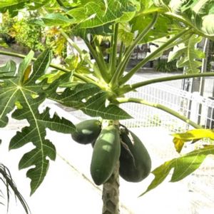 The 沖縄の木 青パパイヤ 宿泊先の鉢植え 食べてもいいと言われて 黄色くなるのを楽しみに待ってたけど…どうも 青パパイヤで生食には向かないらしい💦 パパイヤイリチーはちょっとハードル高く アク抜きしてサラダで食べれば良かったけど… 残念ながらチャレンジしなかった 小玉西瓜は美味しく頂きました🍉