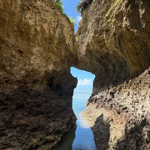 この隙間 なんの形に似てるでしょうか? ヒント どこかの県 答えは 3枚目 大潮の時だけ歩いて渡れる 糸満市のエージナ島 海中には真っ黒なナマコがたくさん💦