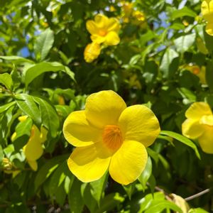 沖縄の日差しに映えるブライトイエローのお花 アラマンダ 有明葛 キョウチクトウ科 アリアケカズラ属 半つる性常緑低木 沖縄でもっとも目立つ黄花のひとつ 英名 golden trumpet vine オオバナアリアケカズラ コバノアリアケカズラ 八重咲きも有るみたいです💛