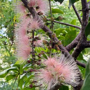 やっと逢えました 写真が趣味の母がずっと見たいと言っていた サガリバナ 長さ20-60cmの総状花序が垂れ下がり 花は横向きにつく 6〜8月の夜間に開き 芳香を放つ 花弁は白または淡紅色で4枚 おしべは多数 開花翌日の午前にはめしべを残して散る 西表島の自生地では散った花が川面に浮く幻想的な様子が見られる 5枚目のタイトルは「花のワルツ」