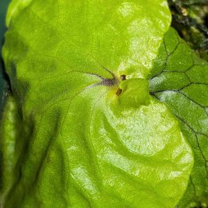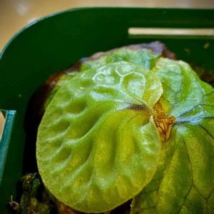 右の貯水葉が茶色というか黒っぽい感じに、、 結構柔らかくて心配です、、 これはただの貯水葉の老化ですか?それとも蒸れや他の要因でなった悪いものですか? わかる方教えて下さい、、 ちなみに左の貯水葉が破けてるのは仕立て直したときに破ってしまったからです、、 湿度は50〜70で完全室内管理です。 LEDはIKEDAの物を使用していて照度は800程度です。 よろしくお願いします。
