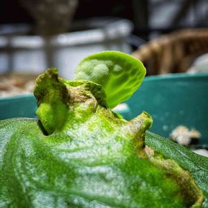 縁あってうちに来た可愛い子ちゃん♡ 小さな新芽がぐんぐん育つ一方で、元々あった反対の古い葉の矢印部分が茶色に変色してきています💧 この葉は置いておいて大丈夫ですか? 薄くしなしなしています。
